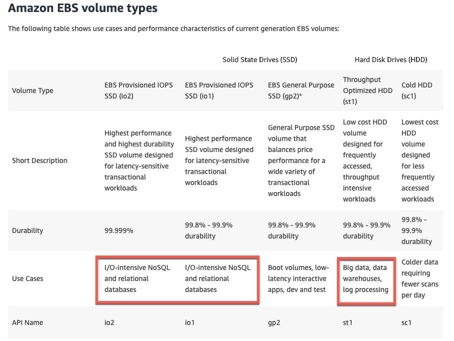 Amazon recommends one of two different options for “I/O-intensive NoSQL and relational databases” plus a third for data warehouses. I’ll tell you right now, if your database is even mildly transactional, you will want to use io1 or io2. Whatever you choose, it will have an affect on the monthly cost – you can see this by checking it out on the AWS Calculator.