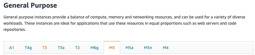 If we go for instance type of M5, we are told that “This family provides a balance of compute, memory, and network resources, and is a good choice for many applications”. Cool, so now you have to pick the instance size: