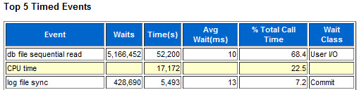 The AWR report was for a 15 minute snapshot and the database was running on a server with 96 cores. The average latency of 10ms meant that in total there were 52,200 seconds lost waiting on db file sequential read (i.e. index lookups, which means random I/O). That’s 870 minutes of CPU time for every minute of elapsed time. To put that another way, for every hour on the wall clock, 58 hours are lost waiting on I/O.