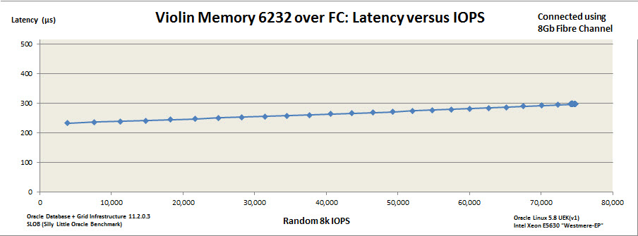 On a disk storage system latency will go through the roof when you reach near-capacity. Flash systems have predictable latency with near-linear increase. Violin is particularly good at this due to the nature of the vRAID technology which protects against the write-cliff (an interesting subject, but this post is long enough without me delving into that). Using SLOB I can generate a latency versus IOPS graph for the 6232 MLC array I currently have in my lab to prove this very point: