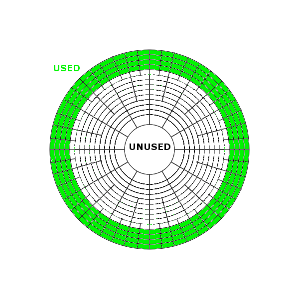 In this traditional model, each sector contains the same amount of data (512 or 4096 bytes plus overheads). Since data is nothing more than bits (zeros and ones) we can say that the density of those bits is greater towards the centre of the platter and lower at the edge. In other words, we aren’t really utilising all of the available platter surface as we move further towards the edge. This directly affects the capacity of the drive, since less data is being stored than the platter can physically allow. There are solutions to this, however – and the most common solution is zoned bit recording.