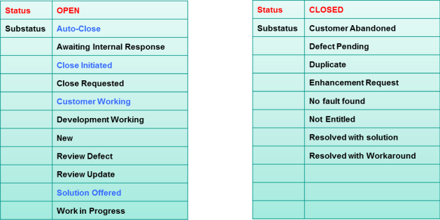Unlike its predecessor Metalink, Orion has two status fields: status and substatus. The allowable values of substatus are dependant on the value of status, which can simply be Open or Closed. Here are the substatus values as I remember them, although of course they are subject to change: