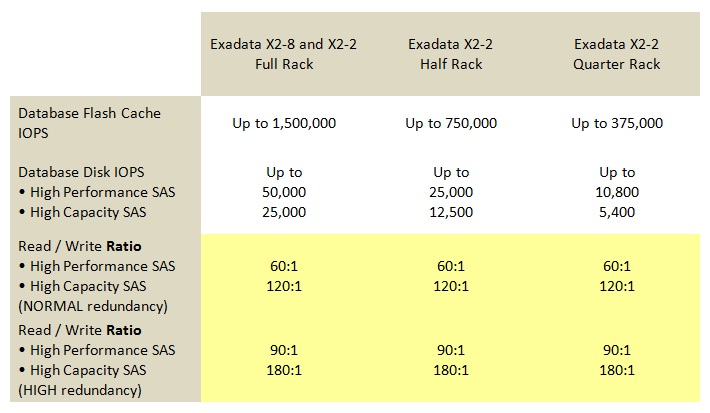 Further to this, since ASM uses software mirroring it can be said that the NORMAL redundancy mode in ASM (basic mirroring) will reduce the effective write IOPS by a half or a third.Since it is known that the Smart Flash Cache is a write-through cache (see page 6 of this white paper), the figures for Database Flash Cache IOPS are for reads only (in this case typically 8k block reads). This means that the write performance is limited to the performance of the disks – in the example of a full rack X2-2 with high performance disks this is 50,000 IOPS.