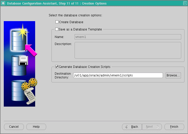 Clicking on Finish will create a set of scripts in the location $ORACLE_BASE/admin/$ORACLE_SID/scripts which I can now edit to allow the database to work with 4k sectors: