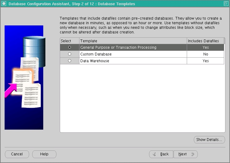 At this point the software is already installed using the same “Software Only” option as I used when installing Grid Infrastructure. I could create my database using SQL, or I could use DBCA to create scripts and then edit them. I’m going to go for the latter. DBCA allows me to choose which Database Template I want to use, so for this example I am going to choose the default General Purpose or Transactional Processing template: